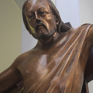 Il Crocifisso, per quanto esprime un momento particolare del sacrificio salvifico, viene rappresentato con una prospettiva teologica che tiene conto dei tre momenti centrali del messaggio kerigmatico: passione, morte e risurrezione. Non è possibile pensare alla passione e alla morte se non nella luce della Risurrezione. Al tempo stesso non è possibile pensare alla Risurrezione senza tener come sfondo la passione e morte. Alla Risurrezione alludono il corpo staccato dalla croce, l’assenza dei chiodi dalla pieghe, la misura della stessa croce, molto più piccola rispetto al corpo. Tutti elementi che dicono la sua vittoria sulla morte. Anche la forma della croce è piuttosto inconsueta: essa segue il dinamismo del corpo glorioso. Le mani del Cristo acquistano un significato simbolico: mentre quella destra è in atto di benedire, quella sinistra accoglie la grazia santificante che viene dal Padre, profusa su chi condivide la sua comunione di vita, espressa dal velo nuziale. Le ferite nelle mani sono forate, come a lasciar intravedere la realtà della vita gloriosa che sta oltre la piaga. All’altezza della cassa toracica è possibile notare la piaga del costato di Cristo. Essa diventa una sola cosa col Mantello ed è la stessa che notiamo anche sul mantello che avvolge l’altare.